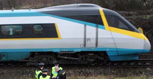 Eisenbahnpolizei, die junge Frau zum Verlassen der Gleise zu bewegen.