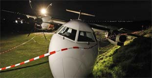 Die Bruchlandung eines zweimotorigen Regionalflugzeugs auf dem Mannheimer Flughafen ist am Mittwochabend glimpflich abgelaufen. Die 24 Passagiere sowie drei Crewmitglieder des Fliegers aus Berlin blieben nahezu unverletzt. Die Polizei sprach von fünf Personen mit leichtesten Verletzungen. Das Flugzeug der Linie Cirrus Airlines war über die Landebahn hinausgeschossen und gegen einen Lärmschutzwall geprallt. Laut Feuerwehr wurden eine Tragfläche und ein Triebwerk des Flugzeugs abgerissen, die Polizei sprach von einem Millionenschaden.