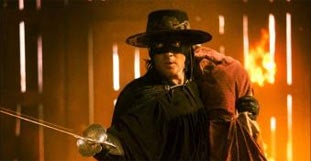 Er wird in seiner typischen Haltung mit Hut, Augenmaske, schwarzem Anzug und gezogenem Degen abgebildet.