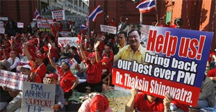 war. Sie trugen rote T-Shirts in der Farbe des Thaksin-Lagers und hielten