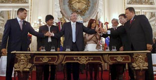 Sieben lateinamerikanische Staaten haben eine gemeinsame Entwicklungsbank gegründet, um eine von den USA unabhängige Kreditquelle für die Region zu schaffen. Die Präsidenten unterzeichneten am Sonntag in Buenos Aires die Gründungsurkunde der neuen Bank des Südens (Banco del Sur). Das Institut mit Sitz in Caracas soll ein Startkapital von fünf bis sieben Milliarden Dollar (3,41 Mrd. bis 4,78 Mrd. Euro) erhalten, größte Geldgeber sind voraussichtlich Brasilien und Venezuela.