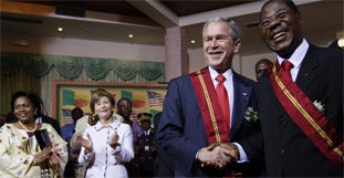 Zum Auftakt seiner einwöchigen Afrikareise ist US-Präsident George W. Bush am Samstag in der westafrikanischen Republik Benin gelandet. Nach Angaben des Weißen Hauses will Bush die Vereinigten Staaten als verlässlichen Partner im Kampf gegen Probleme wie Armut und Krankheiten präsentieren, aber auch als Partner beim wirtschaftlichen Aufbau des Kontinents. Dabei dürfte Bush auch die Konkurrenz Chinas bei den Investitionen in Afrika im Auge haben.