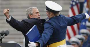 Sehenswerte Kadetten-Verabschiedung durch einen gut gelaunten US-Präsidenten: Statt des üblichen verbalen Glückwunsches entschied sich George W. Bush bei der militärischen Feier, mit einem Soldaten „persönlich zusammenzustoßen“.