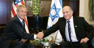 Nach der Begrüßung durch Staatspräsident Shimon Peres und Ministerpräsident Ehud Olmert in Tel Aviv flogen Bush und seine Frau Laura mit dem Hubschrauber nach Jerusalem, wo sie an den offiziellen Feierlichkeiten zum 60. Jahrestag der Ausrufung des Staates Israel teilnehmen. "Unsere beiden Länder standen vor großen Herausforderungen, als sie gegründet wurden", sagte Bush noch im Ben-Gurion-Flughafen. "Unsere beiden Länder haben sich auf die gleichen Prinzipien verlassen, um erfolgreich zu sein. Wir haben starke Demokratien aufgebaut, um die Freiheit zu schützen, die uns Gott gegeben hat. Und wir haben eine dauerhafte Allianz aufgebaut, um Terroristen und Tyrannen zu begegnen."