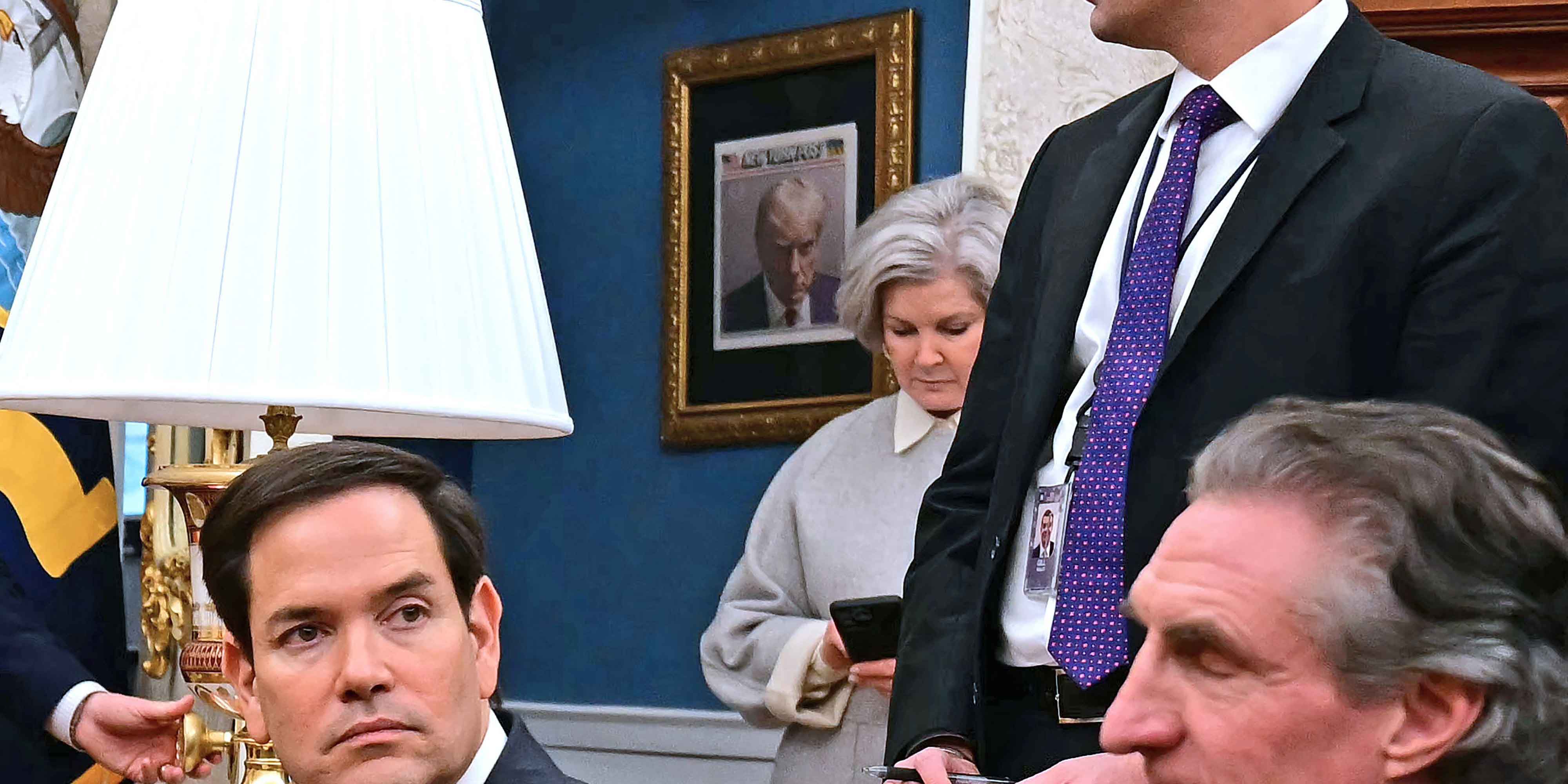 Mehrere US-Medien berichteten zudem, dass das Bild auf Fotos von Trumps Treffen, etwa mit Indiens Premier Narendra Modi am Donnerstag (Ortszeit), durch eine offene Tür zu sehen sei. Das bekannte Polizeifoto war 2023 in einem Gefängnis in Atlanta aufgenommen worden, nachdem im Bundesstaat Georgia Anklage gegen Trump erhoben worden war im Zusammenhang mit versuchtem Wahlbetrug. Er ist der erste verurteilte Straftäter in seinem Amt.