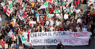 Hunderttausende Menschen beteiligten sich laut den Organisatoren an der Protestkundgebung, zu der die Demokratische Partei (PD, Italiens stärkste Oppositionspartei) aufgerufen hat. Es handelt sich um die erste Großkundgebung der Opposition gegen die Mitte-rechts-Regierung um den Ministerpräsidenten und TV-Zaren Silvio Berlusconi seit dessen Wahlerfolg bei den Parlamentswahlen im April.