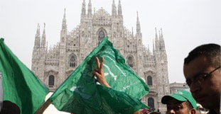 Moslems auf dem Domplatz in Mailand und in Bologna vor der Kirche San
