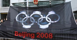 Vertreter der internationalen Journalistenorganisation "Reporter ohne Grenzen" (RSF/RoG) haben heute, Montag, in Hongkong eine überdimensionale Flagge mit dem Logo der Kampagne "Peking 2008" enthüllt. Sie zeigt Handstellen in Form der Olympischen Ringe. RSF protestiert damit gegen die Verletzungen der Menschenrechte und der Pressefreiheit im Land des Olympia-Gastgebers China, heißt es in einer Aussendung.