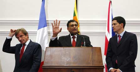 Im Konflikt zwischen Armee und Tamilen-Rebellen in Sri Lanka sind die Außenminister Frankreichs und Großbritanniens mit ihren Bemühungen um eine Waffenruhe gescheitert. Sie hätten sich sehr bemüht, sagte der französische Außenminister Bernard Kouchner am Mittwoch nach einem Treffen mit seinem srilankesischen Kollegen Rohitha Bogollagama in Colombo. Letztlich hänge es aber von der Regierung in Colombo ab, ob sie eine Feuerpause gewähre. Der britische Außenminister David Miliband erklärte, dass mit der geforderten Waffenruhe Zivilisten aus dem Kampfgebiet gerettet werden sollten und keine tamilischen Kämpfer oder gar Rebellenchef Velupillai Prabhakaran.