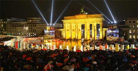Am Brandenburger Tor in Berlin hat am Montagabend das Fest der Freiheit zum 20. Jahrestag des Falls der Berliner Mauer begonnen. Berlins Regierender Bürgermeister Klaus Wowereit begrüßte Zehntausende Menschen, die schon in den Stunden vorher im strömenden Regen zum Pariser Platz gekommen waren. Das Orchester der Staatsoper Berlin spielte unter der Leitung von Daniel Barenboim Musik von Richard Wagner, Arnold Schönberg und Ludwig van Beethoven.