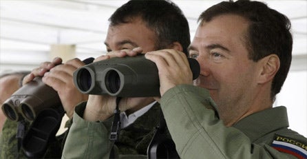 Im Bemühen um ein etwas härteres Image hat der russische Präsident Dmitri Medwedew am Montag seinen dunklen Anzug gegen eine grüne Militärjacke ausgetauscht und mit einem Maschinengewehr hantiert. Er verfolgte ein Militärmanöver in der russischen Exklave Kaliningrad , dem ehemaligen Königsberg, und inspizierte Waffen und andere militärische Gegenstände, wie Fernsehbilder zeigten.