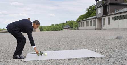 US-Präsident Barack Obama hat am Freitag in der KZ-Gedenkstätte Buchenwald bei Weimar der Opfer des Nationalsozialismus gedacht. Zusammen mit der deutschen Kanzlerin Angela Merkel legte er am Gedenkstein eine weiße Rose nieder.