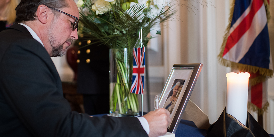 Außenminister Alexander Schallenberg (ÖVP) hat sich im Namen der Bundesregierung in das Kondolenzbuch eingetragen, das die britische Botschaft in Wien anlässlich des Todes von Königin Elizabeth II. aufgelegt hat.