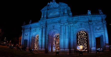 blauen Farbe der EU-Flagge. Dazu zählten der Königspalast in Madrid, das