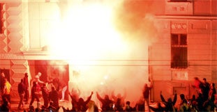 ausgebrannten Gebäude der US-Botschaft und jenem der albanischen Vertretung.