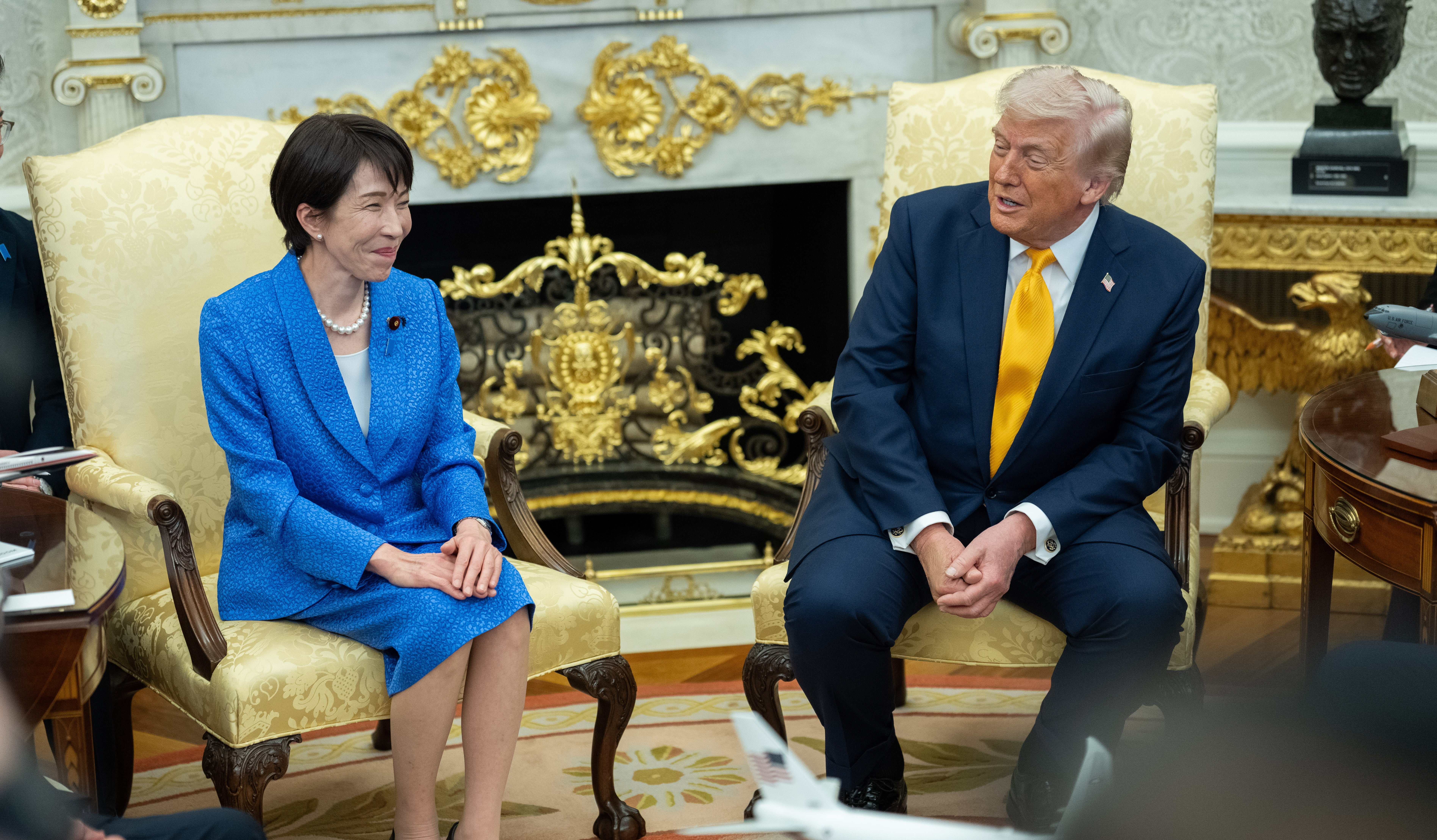 "Warum haben sie mir nichts über Pearl Harbor gesagt", fragte Trump an die Japaner gerichtet. Er glaube, Japan setze noch viel stärker auf Überraschungen als die USA. Takaichi richtete sich daraufhin sichtlich angespannt in ihrem Sessel auf und blickte mit großen Augen in die Richtung ihrer Delegation.