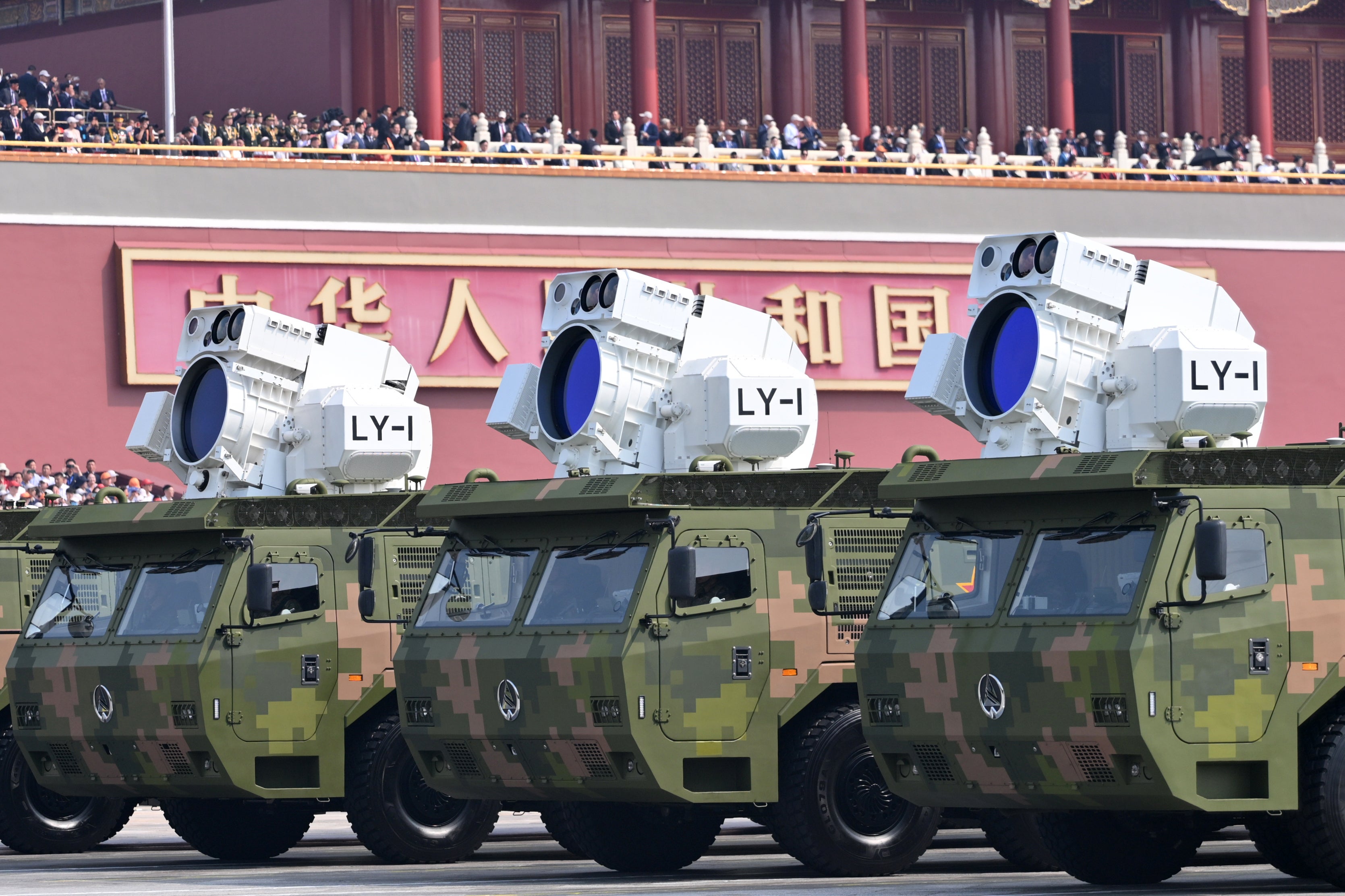 Die Parade mit ihren 45 Formationen enthüllte auch neue, in China hergestellte Waffen. Große Beachtung fanden ein mobiler Laser, der zur Abwehr von Drohnenschwärmen dienen könnte, und eine torpedoförmige Unterwasser-Drohne sowie ein unbemanntes Patrouillenboot.