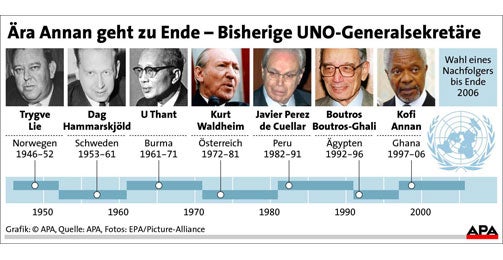 Zum letzten Mal eröffnet heute UNO-Generalsekretär Kofi Annan die Vollversammlung. Das waren seine Vorgänger.