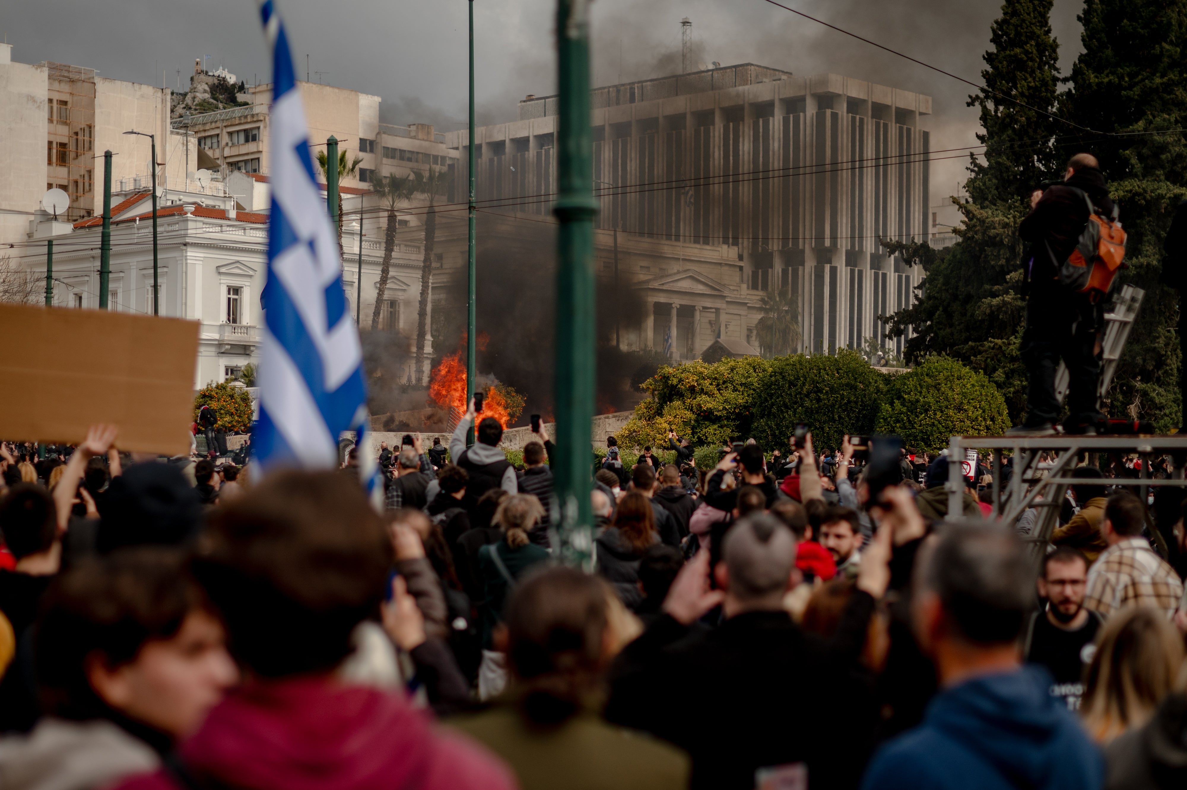 Nach Ende der Veranstaltung randalierten Hunderte Autonome und Hooligans und lieferten sich Straßenschlachten mit der Polizei. Die Polizei setzte Tränengas gegen vermummte Demonstranten ein, die Brandsätze warfen. Die Menschen werfen der Regierung vor, die Umstände des Frontalzusammenstoßes zwischen einem Güter- und einem Personenzug am 28. Februar 2023 in Tempi nicht ordentlich aufzuarbeiten. "Nein zur Vertuschung" und "Wir vergessen nicht" stand auf den Plakaten der Demonstranten. "Mörder" riefen sie an die Regierung gerichtet.
