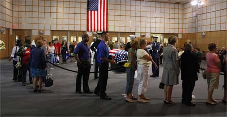 Bürger, an dem mit einer US-Flagge geschmückten Sarg vorbeizuziehen und