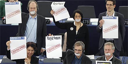 Die Grünen im Europaparlament haben den ungarische Ministerpräsident Viktor Orban am Mittwoch mit einer Protestaktion gegen das umstrittene ungarische Mediengesetz im Straßburger Europaparlament empfangen. Mehrere Abgeordnete hoben Transparente in der Machart von Zeitungen hervor, auf denen "Zensur" stand. Außerdem verklebten sich viele symbolisch den Mund.