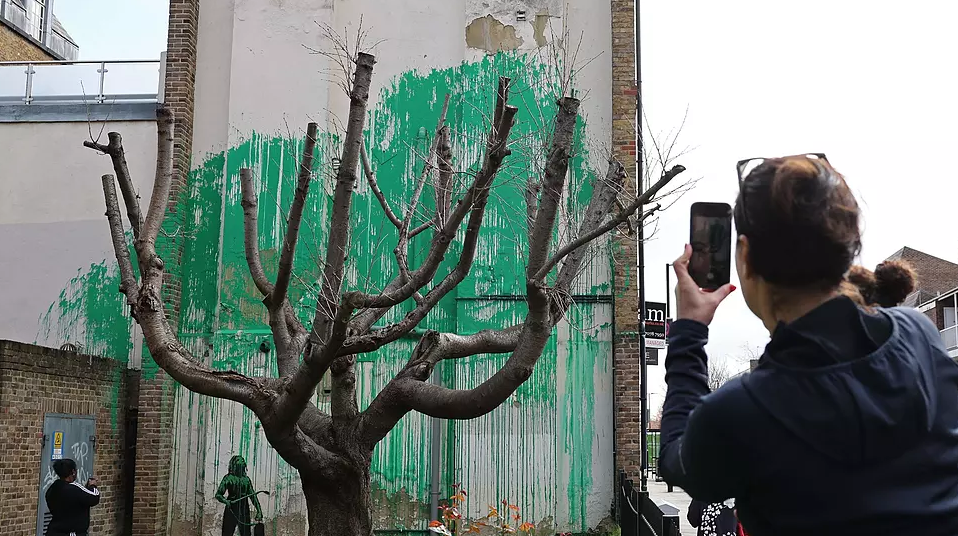 Es war ein ganz neues Kunstwerk des Künstlers Banksy: Grüne Farbe ist auf eine weiße Wand hinter einem kahlen Baum gesprüht worden. Es sah so aus, als ob die grüne Farbe die Blätter des Baumes gewesen sind. Am Mittwoch ist bekannt geworden, dass das Kunstwerk von unbekannten Tätern mit weißer Farbe zerstört worden ist.