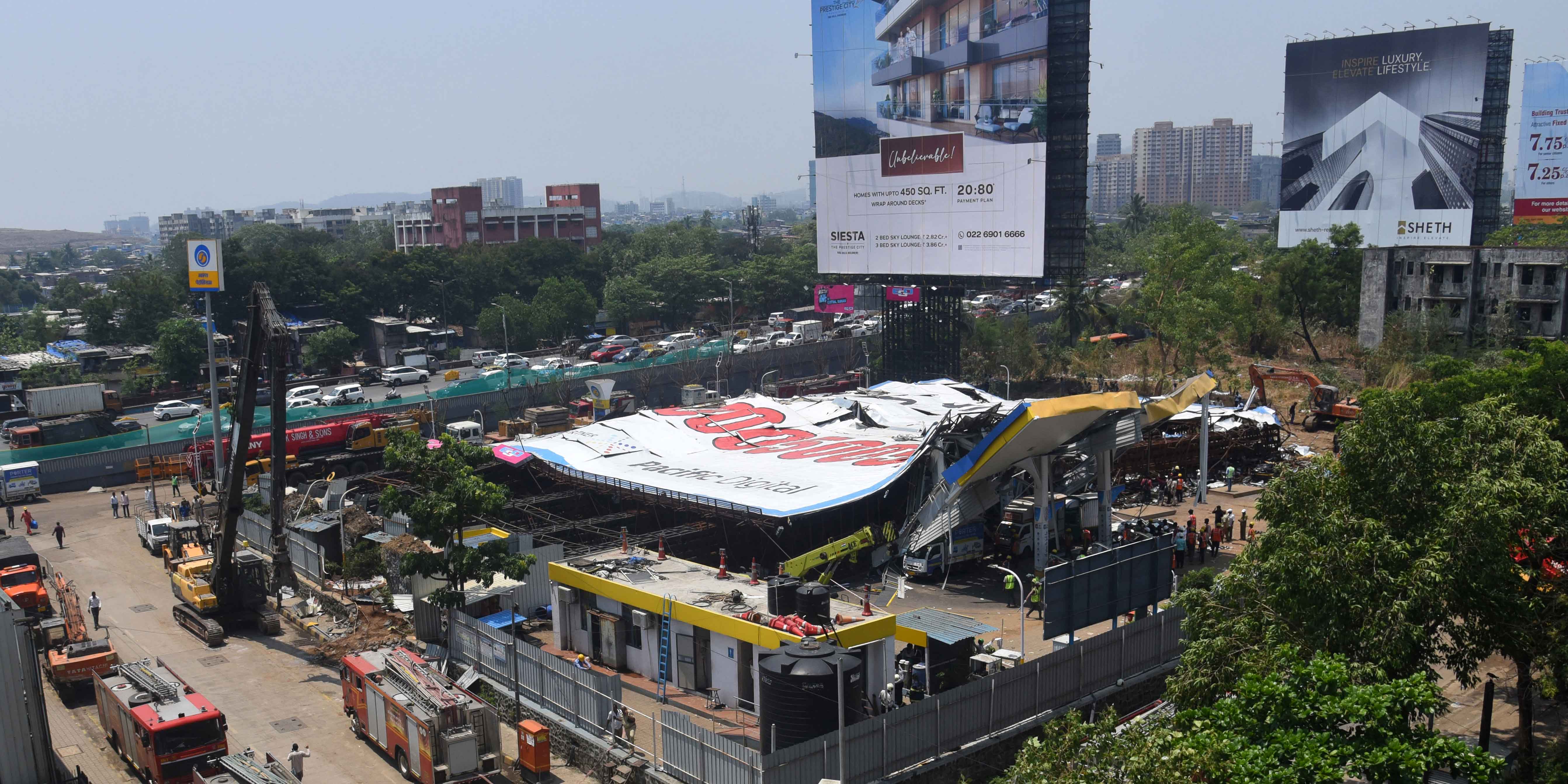 Die 70 mal 50 Meter große Reklametafel war am Montag in einem Sturm umgeweht worden und auf eine Tankstelle im Osten Mumbais gekracht. Gaurav Chauhan von der Katastrophenschutzbehörde sagte, die Aufräumarbeiten seien kompliziert, weil das Schild direkt auf eine Zapfsäule gestürzt sei. Wegen hoher Brandgefahr könnten die Einsatzkräfte nicht die übliche Ausrüstung nutzen, sondern müssten die Trümmer mit Kränen anheben.