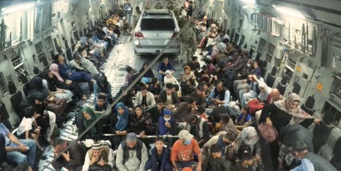 Wie ein Video von "Sky News" zeigt, befindet sich im Inneren eines Flugzeuges neben geflüchteten Menschen auch ein Auto. Die Aufnahmen des Wagens sorgten auf Twitter bereits für einen Shitstorm.