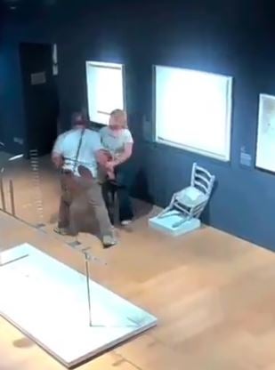 Wie in einem Video zu sehen ist, das das Museum selbst veröffentlicht hat, befinden sich zwei Besucher allein in dem Raum, in dem das Kunstwerk ausgestellt ist. Das Paar wartet, bis das Sicherheitspersonal den Raum verlässt, der beleibte Mann nähert sich dem Ausstellungsstück, setzt sich darauf.