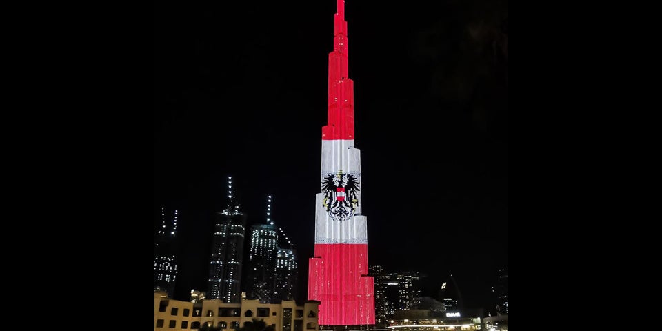Dubai. Das höchste Gebäude der Welt, der 828 Meter hohe Wolkenkratzer Burj Khalifa (Burdsch Chalifa) in Dubai in den Vereinigen Arabischen Emiraten, ist am Nationalfeiertag in Rot-Weiß-Rot samt Bundesadler erstrahlt. "Wir wünschen ihnen Frieden und Wachstum", wurde den Österreichern auf dem Twitter-Account des gigantischen Gebäudes zum 26. Oktober gratuliert.