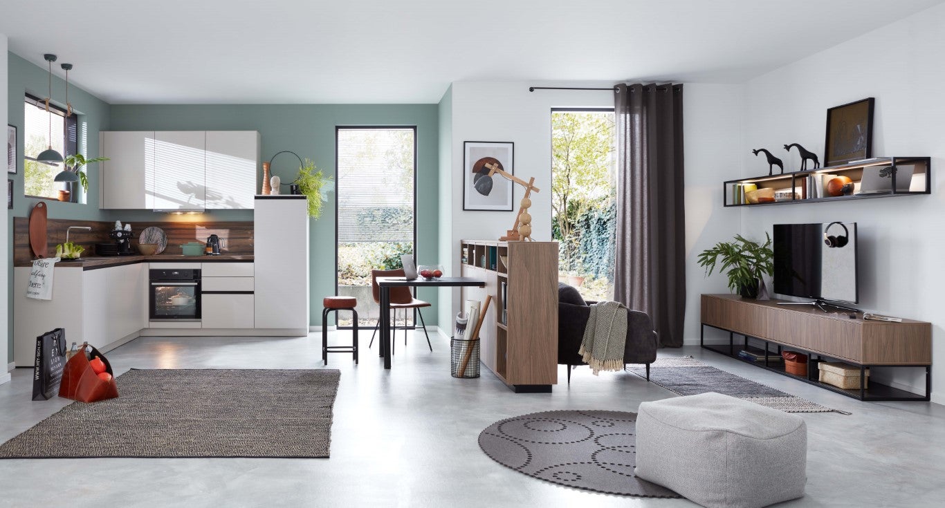 Ein offener Wohnbereich soll eine unaufgeregte und gemütliche Raumatmosphäre bieten. Das schaffen Sie indem Sie darauf achten, den Einrichtungsstil harmonisch zu halten. Das bedeutet konkret: Stimmen Sie Elemente wie das Design der Möbel, die Bodenbeläge und sämtliche Materialien aufeinander ab. Eine Vintage-Küche mit Wohnzimmermöbeln im modernen oder Industrial Look zu kombinieren, wirkt beispielsweise schnell unausgewogen. Akzente können natürlich gesetzt werden – dann aber ganz gezielt und nach dem Motto "weniger ist mehr".